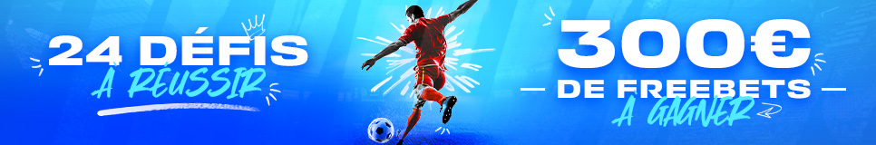 - Si vous validez les 24 défis, vous obtenez 0,50 + 1 + 1,50 + 2 + 2,50 + 3 + 3,50 + 4 + 4,50 + 5 + 5,50 + 6 + 6,50 + 7 + 7,50 + 8 + 10 + 12 + 20 + 25 + 30 + 40 + 45 + 50 = 300 € de Freebets.